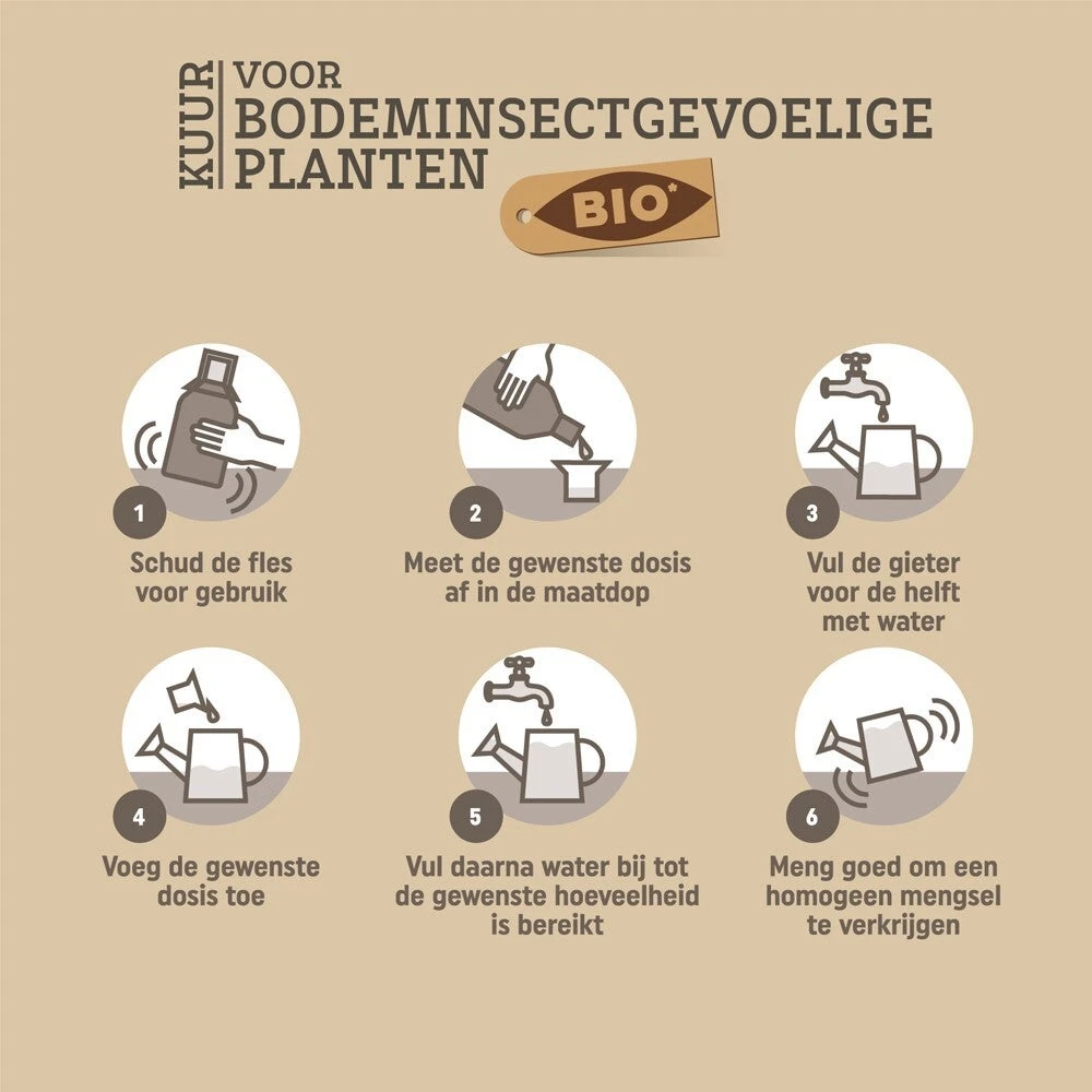 Tijdens de groeiperiode van de plant kan de Pokon Bio Kuur voor Bodeminsectgevoelige Planten worden gebruikt. Voor een optimale werking herhaal je elke vier weken de behandeling. Wanneer nodig kan de behandeling sneller worden herhaald.