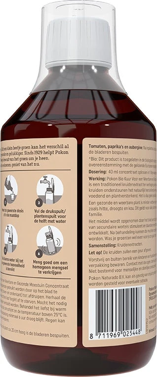 Pokon Bio Kuur voor Weerbare en Gezonde Moestuin Concentraat is een kruidenextract dat bijdraagt aan de verhoging van de weerbaarheid. De kruiden werken verzorgend, ondersteunen het natuurlijk herstellend vermogen, voeden en versterken de plant. Het is te gebruiken op alle planten van de nachtschadefamilie, maar ook op tomaten, paprika en aubergine in pot of moestuin.