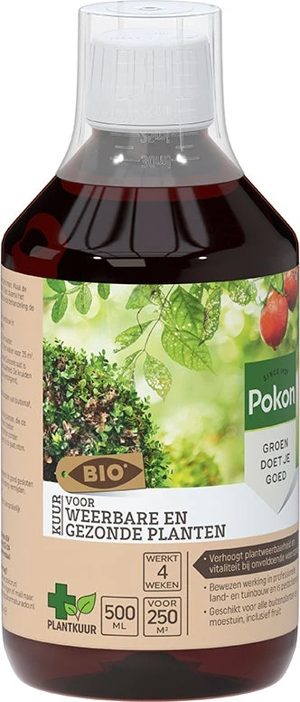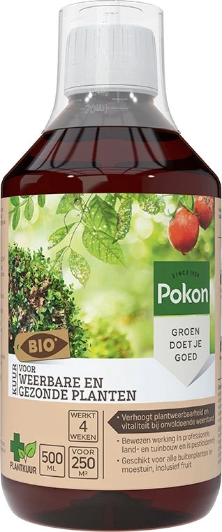 Door de weerbaarheid van planten te verhogen zijn deze beter bestand tegen invloeden van buitenaf zoals hitte en droogte, maar ook kou. De Pokon Bio Kuur voor Weerbare en Gezonde Planten is een kruidenextract dat de weerbaarheid verhoogt. Ook ondersteunen de kruiden het herstellend vermogen van de plant, werken ze verzorgend, voedend en plantversterkend. Deze Bio Kuur is pesticidevrij.