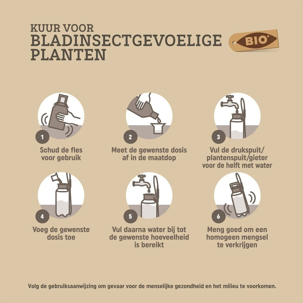 Gedurende de groeiperiode kan deze kuur worden gebruikt om bladinsecten te weren. Door de behandeling elke vier weken te herhalen zorg je voor een optimaal resultaat. Wanneer nodig kan de behandeling sneller worden herhaald.