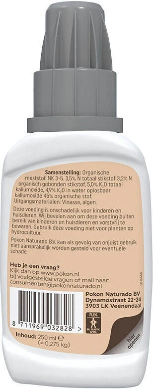 Deze plantenvoeding bevat de samengestelde organische meststof NPK 3-2-5. Gebruik deze plantenvoeding niet voor planten die op hydrocultuur staan.