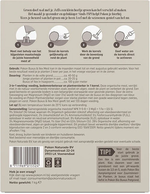 Pokon Buxus en Ilex Mest 1 kg is een organische 3-in-1 korrel speciaal voor buxus en ilex die tot 120 dagen werkt. De mestkorrel bevat voeding, bodemverbeteraar en een plantversterker. Pokon Buxus en Ilex Mest 1 Kg zorgt ervoor dat de buxussen en ilexen goed groeien en diepgroen zijn. Tevens verbeterd het de weerstand tegen ziektes en plagen.