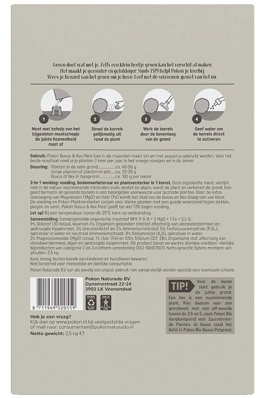 3-in-1 werking: voeding, bodemverbeteraar en plantversterker in 1 korrel. De organische mest van de Pokon Buxus & Ilex Mest, verrijkt met in de natuur voorkomende mineralen zoals zeoliet en algen, voedt de plant en verbetert de grond. Een goed bemeste en gezonde bodem is een belangrijke voorwaarde voor gezonde planten. Door de extra toevoeging van Magnesium (Mg0) en IJzer (Fe) wordt het blad van de buxus en ilex diepgroen van kleur. De voeding en Pokon Plantenversterker zorgen voor sterke planten met een goede weerstand tegen ziektes, plagen en vorst. Pokon Buxus & Ilex Mest geeft tot wel 120 dagen voeding. Pokon Buxus & Ilex Mest kan in de maanden maart t/m augustus gebruikt worden. Voor het beste resultaat voed je je planten 2 keer per jaar, in het vroege voorjaar en in de zomer.