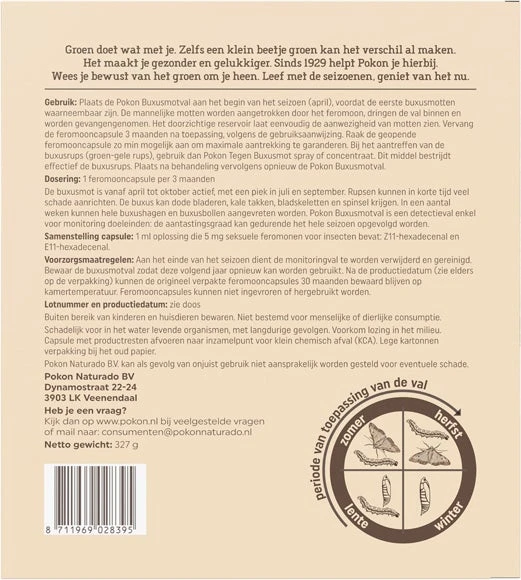 Deze Pokon Buxusmotval plaats je aan het begin van het seizoen, nog voor de eerste motten zijn waargenomen. Het seizoen waarin de buxusmot actief is loopt van april tot en met oktober.
