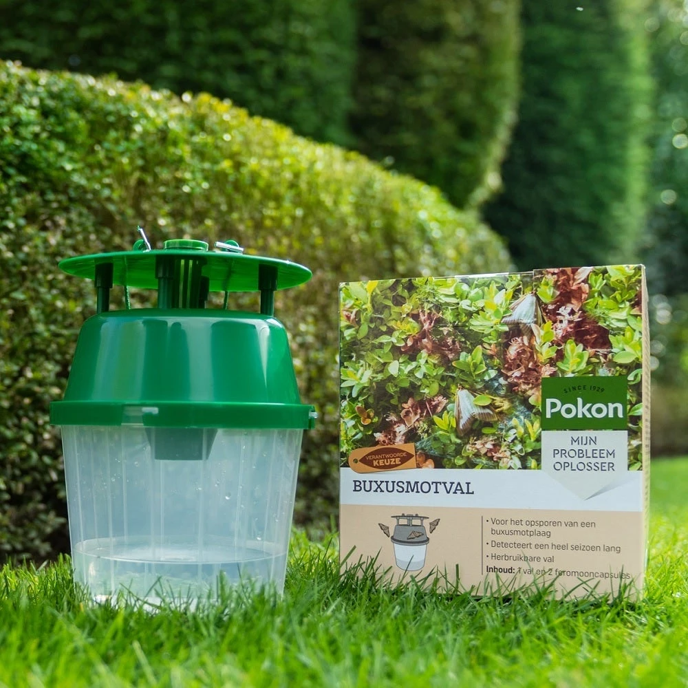De Pokon Buxusmotval helpt om de aantastingsgraad gedurende het seizoen te volgen. Op die manier weet je precies wanneer je actie moet ondernemen om erger te voorkomen. Deze val is een detectieval waarmee je het aantal buxusmotten kunt monitoren.