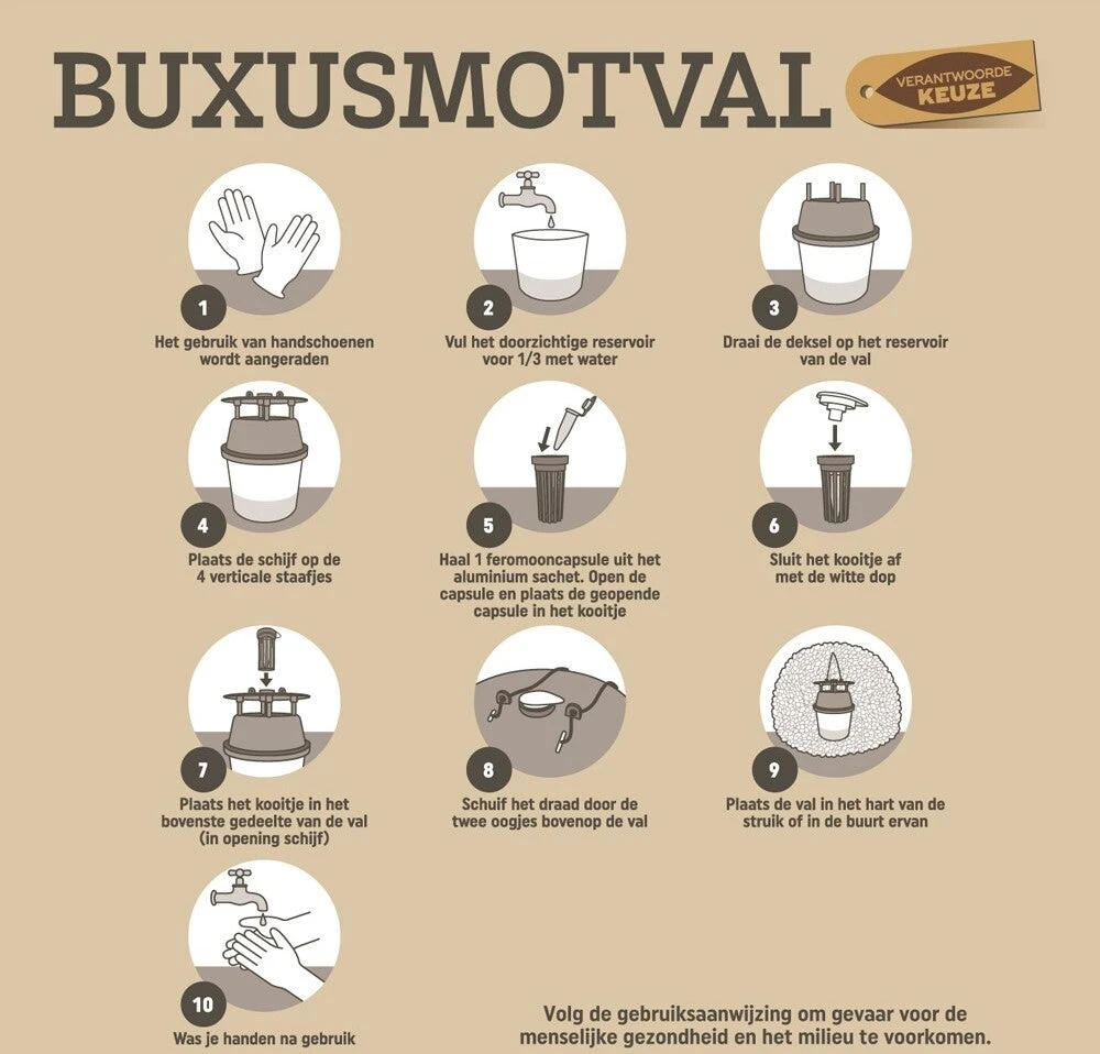 - Trek handschoenen aan bij het plaatsen van de buxusmotval.