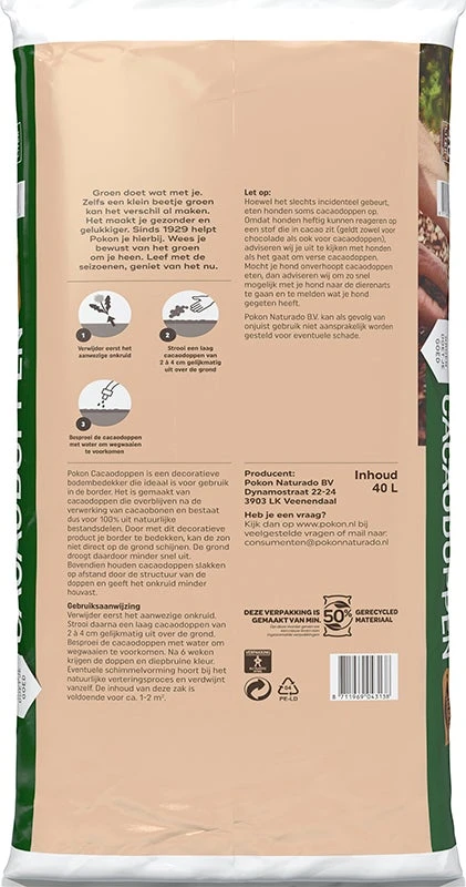 Je kunt Pokon Cacaodoppen gebruiken als decoratieve bodembedekker in de border. Het is een 100% natuurlijke bodembedekker die wordt gemaakt van de overblijfselen na de verwerking van cacaobonen.