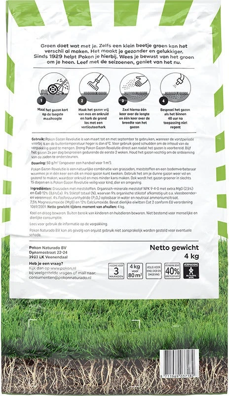 Pokon Gazon Revolutie is een handig alles in één product. Het bevat een natuurlijke combinatie van graszaden, meststoffen en een bodemverbeteraar. Hiermee kweek je in één keer een dik en mooi gazon. Ook is Pokon Gazon Revolutie geschikt om een dun gazon weer mooi vol en gezond mee te maken. Onkruid en mos krijgen hierdoor minder kans. In slechts 15 dagen wordt het gazon groener. Dit product is veilig voor kind, dier en omgeving.