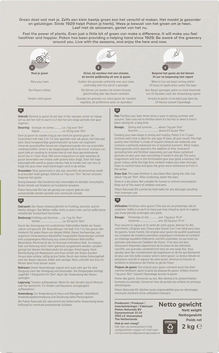 Pokon Gazonmest Met Kalk – 2kg – Mest – Geschikt Voor 30m² – 120 Dagen Voeding