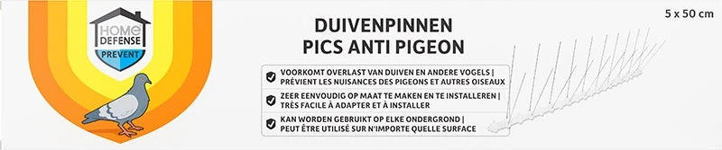 HD Duivenpinnen voorkom je dat duiven en andere vogels op plekken gaan zitten waar ze overlast veroorzaken. De pinnen kunnen geplaatst worden op vensterbanken, muurtjes, dakgoten, nokken, balustrades, monumenten en schoorstenen. Door het plaatsen van deze pinnen voorkom je vervuiling, nesten of geluidsoverlast van vogels. De pinnen dienen enkel als afschrikmiddel en brengen geen schade aan vogels