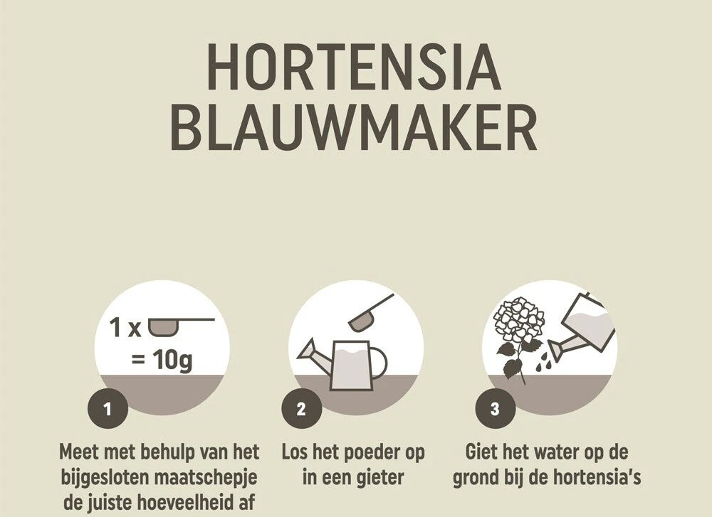 Voor het behoud van een mooie blauwe kleur behandel je jouw hortensia’s tweemaal per jaar. Behandel bij voorkeur in het najaar (september/oktober) en in het voorjaar, voor de bloei van start gaat (maart/april). Om te voorkomen dat de hortensia’s na de behandeling in fel zonlicht komen te staan kan de behandeling het beste in de avond worden uitgevoerd.