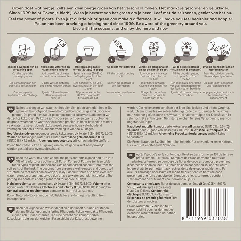 Pokon Potgrond Compact is een potgrond die je zowel binnen als buiten kunt gebruiken. De potgrond bevat voeding voor ongeveer 60 dagen. In tegenstelling tot standaard potgrond ontvang je Pokon Potgrond Compact in de vorm van een blok. Na het toevoegen van water verandert het blok binnen enkele minuten in 10 of 30 liter – afhankelijk van de verpakking – gebruiksklare potgrond.