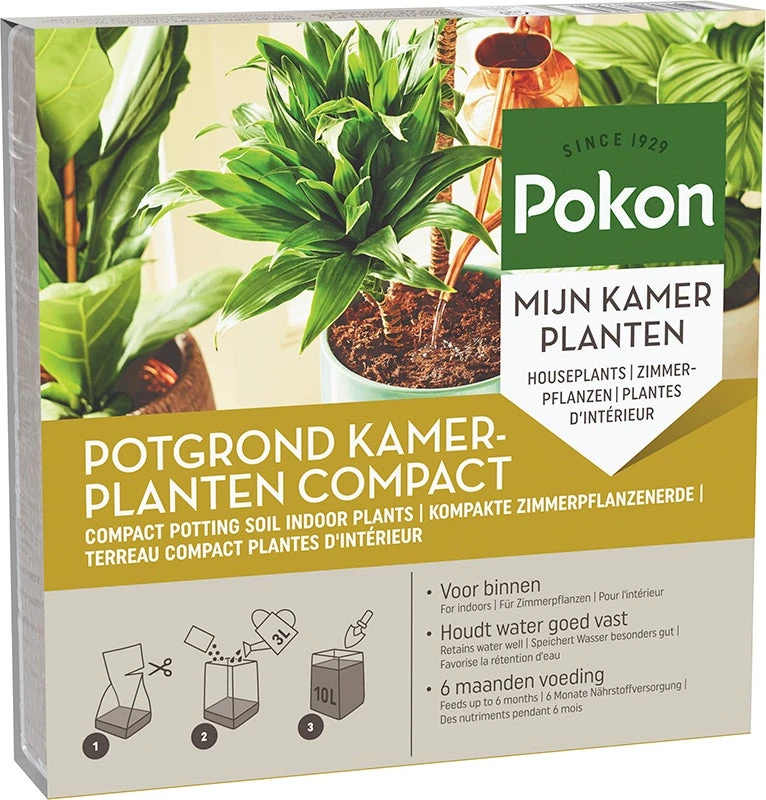 Bij ontvangst is Pokon Potgrond Kamerplanten Compact een vast blok. Door water toe te voegen aan de zak met het blok verandert de potgrond in 10 liter gebruiksklare potgrond. Deze potgrond is geschikt voor alle kamerplanten.